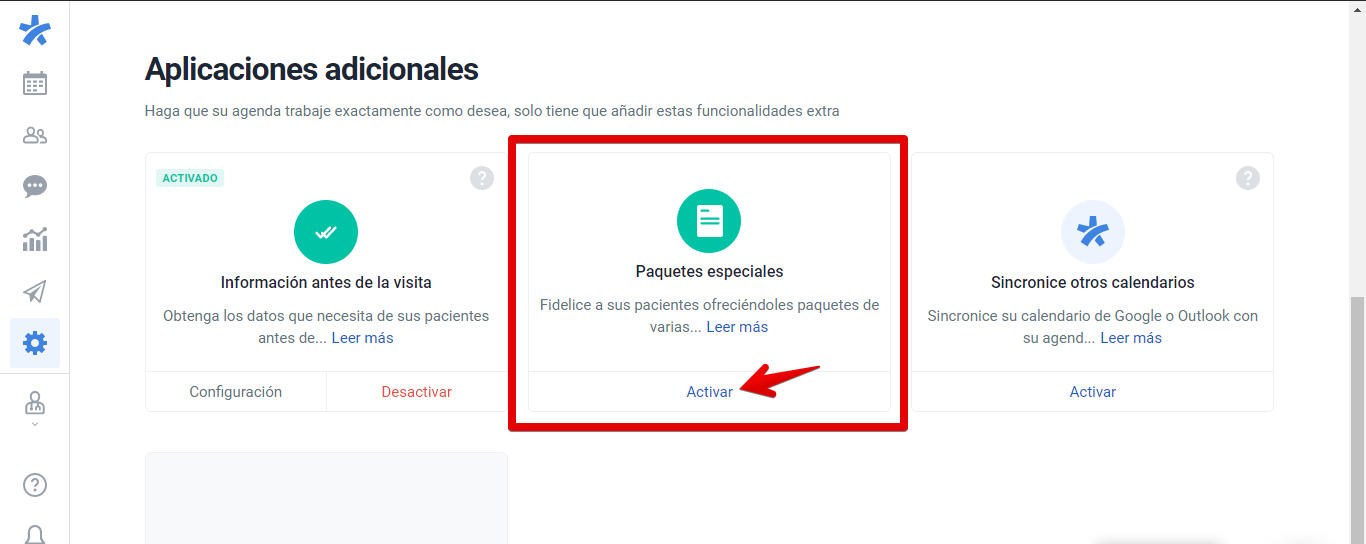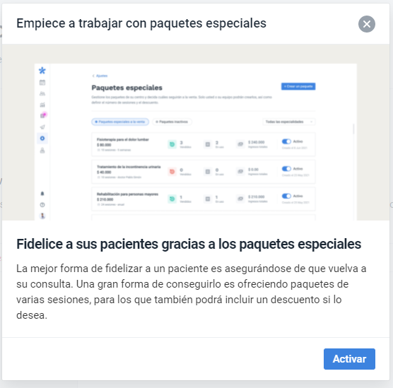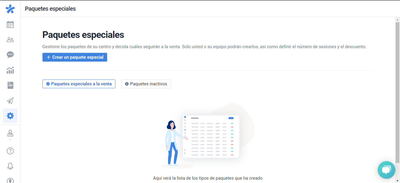 Automáticamente después de hacer clic en "Activar", aparecerá un nuevo icono en el menú lateral izquierdo de su agenda correspondiente a la nueva funcionalidad de "Paquetes especiales" y se le redirigirá a la pantalla de creación y gestión de paquetes (desde ese momento, también podrá acceder a ella siempre que lo desee haciendo clic en Ajustes > paquetes especiales > Ajustes).