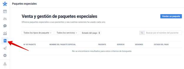 Paso 1: Acceda su agenda y haga clic en el icono correspondiente a los paquetes que encontrará en el menú lateral izquierdo para acceder a la página de "venta y gestión de paquetes especiales".