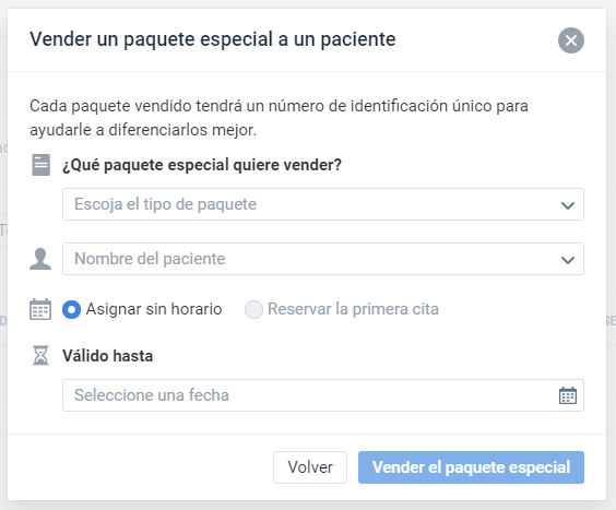 Paso 3: A continuación, podrá elegir el paquete que desea vender y a qué paciente, junto con otras especificaciones, como por ejemplo si desea crear también una cita o si por el contrario prefiere no hacerlo en ese momento, y si quiere añadir una fecha de caducidad para que el paciente pueda utilizar el paquete solo durante un período determinado.