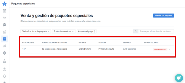 Paso 4: Cuando haya configurado todas las opciones, haga clic en "Vender paquete especial" y este aparecerá automáticamente en el listado de paquetes vendidos, desde donde podrá consultar también el número de sesiones pendientes y el estado del pago.