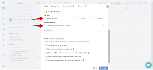 Paso 4: Una vez seleccionado el paquete y completados todos los datos, haz click en "Crear cita" y esta aparecerá con un icono que nos permitirá identificar a primera vista de que se trata de una cita con un paquete vinculado.